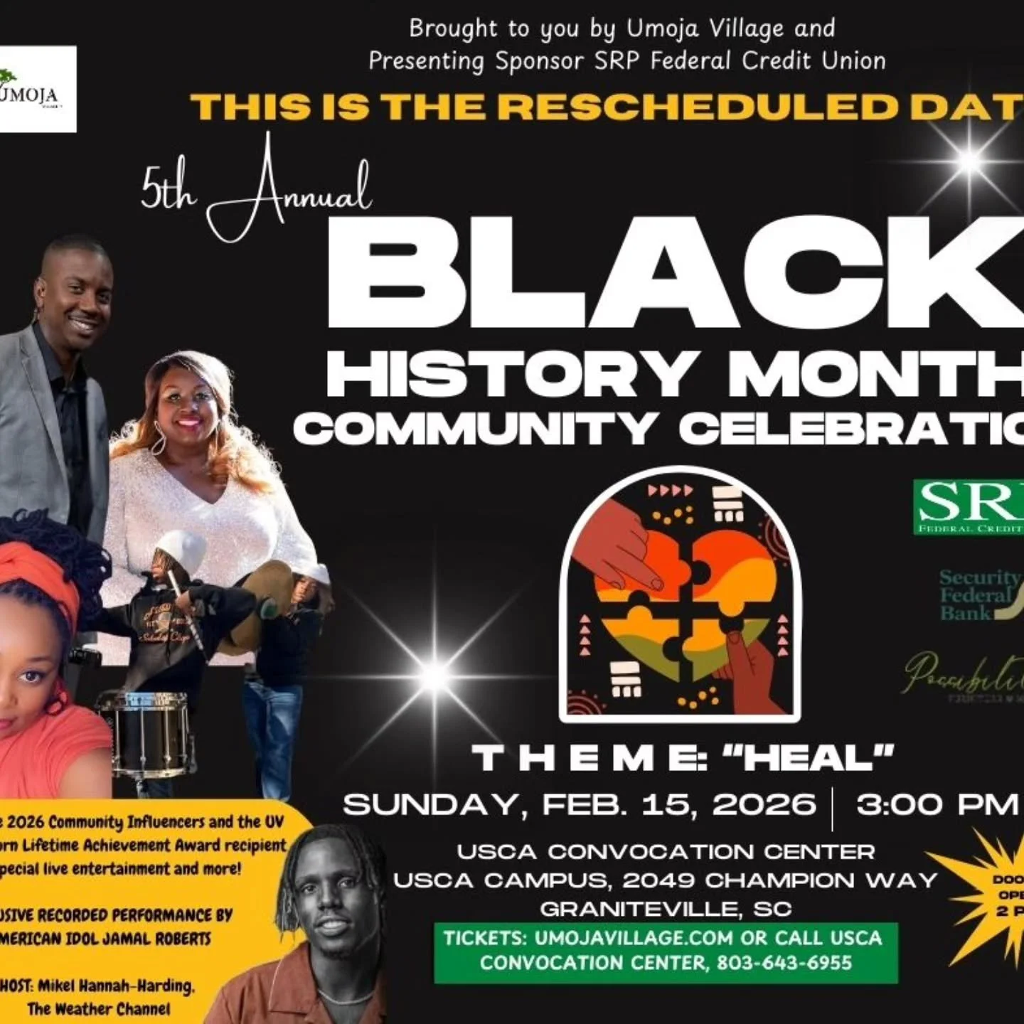 Get Ready!This phenomenal event will include four ticket options to accommodate all budgets with a catered buffet for floor seating, a special, exclusive 20-minute studio performance specifically for this event from American Idol Jamal Roberts, heartfelt tributes, and recognition of the 12 Umoja Village Unsung Heroes featured in the 2026Umoja Village Celebrates Black Excellence calendar.