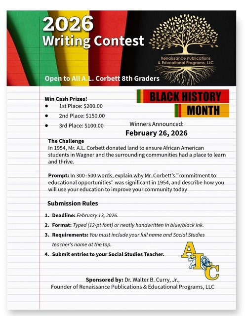 The 2026 A.L. Corbett Writing Contest invites 8th-grade students to reflect on the legacy of A.L. Corbett and his commitment to education as a pathway to opportunity. In honor of Black History Month, students will write a 300–500 word essay exploring why educational access mattered in 1954 and how they plan to use their own education to positively impact their community today. Cash prizes will be awarded to top submissions!