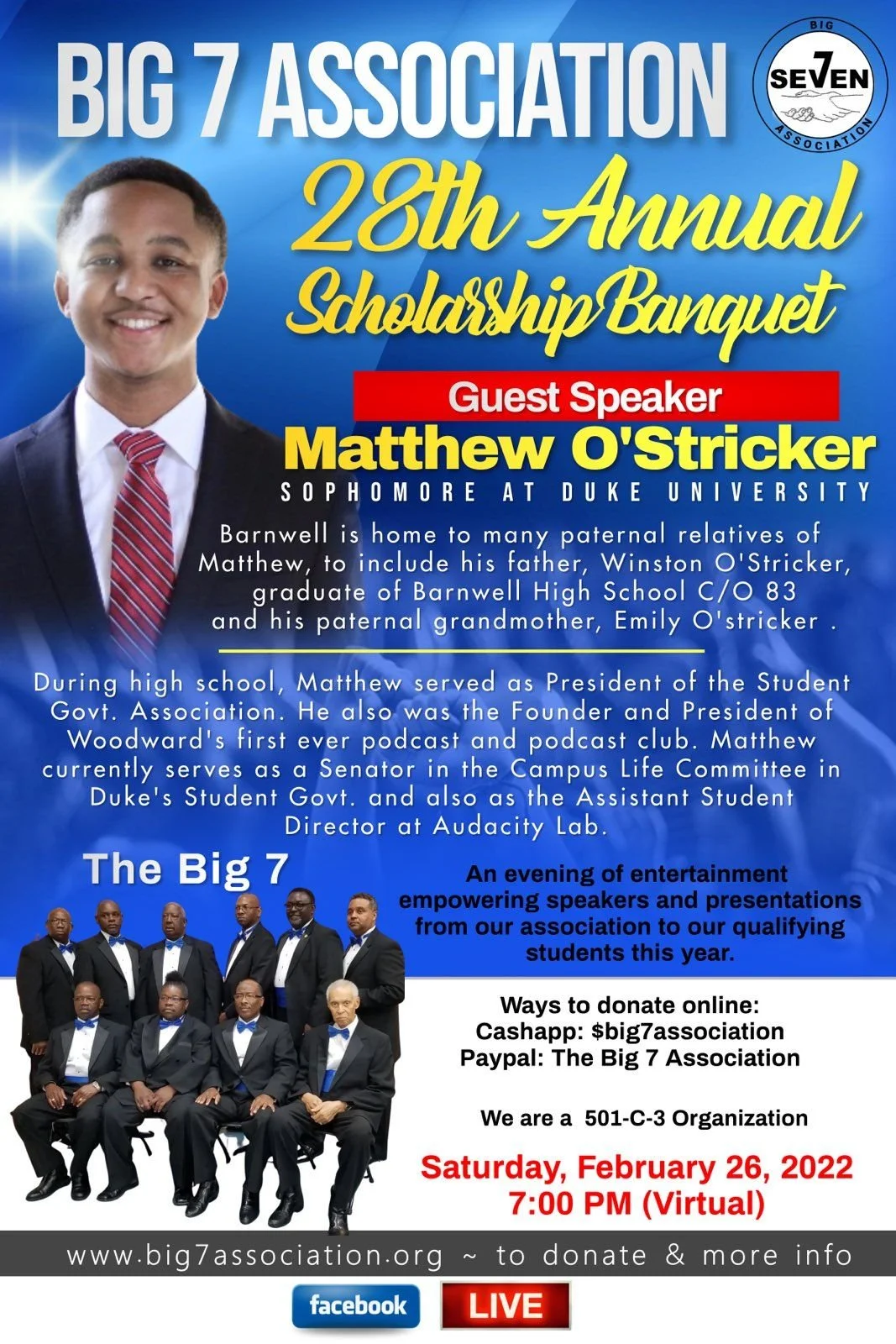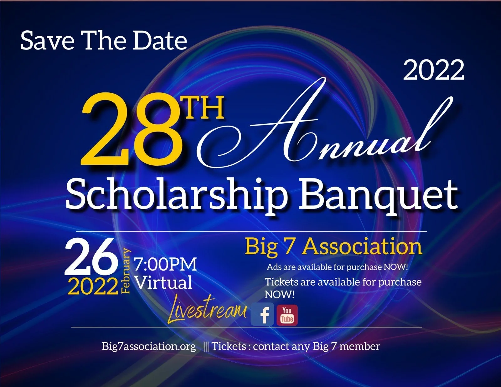 28th Annual Big7 Scholarship Banquet Saturday, February 26, 2022 7:00 PM 8:30 PM 19:00 20:30 Google Calendar ICS SPONSORING ORGANIZATIONBig7 AssociationLOCATIONVirtualREGISTRATION LINK/NUMBERwww.big7association.org/ View fullsize View fullsize