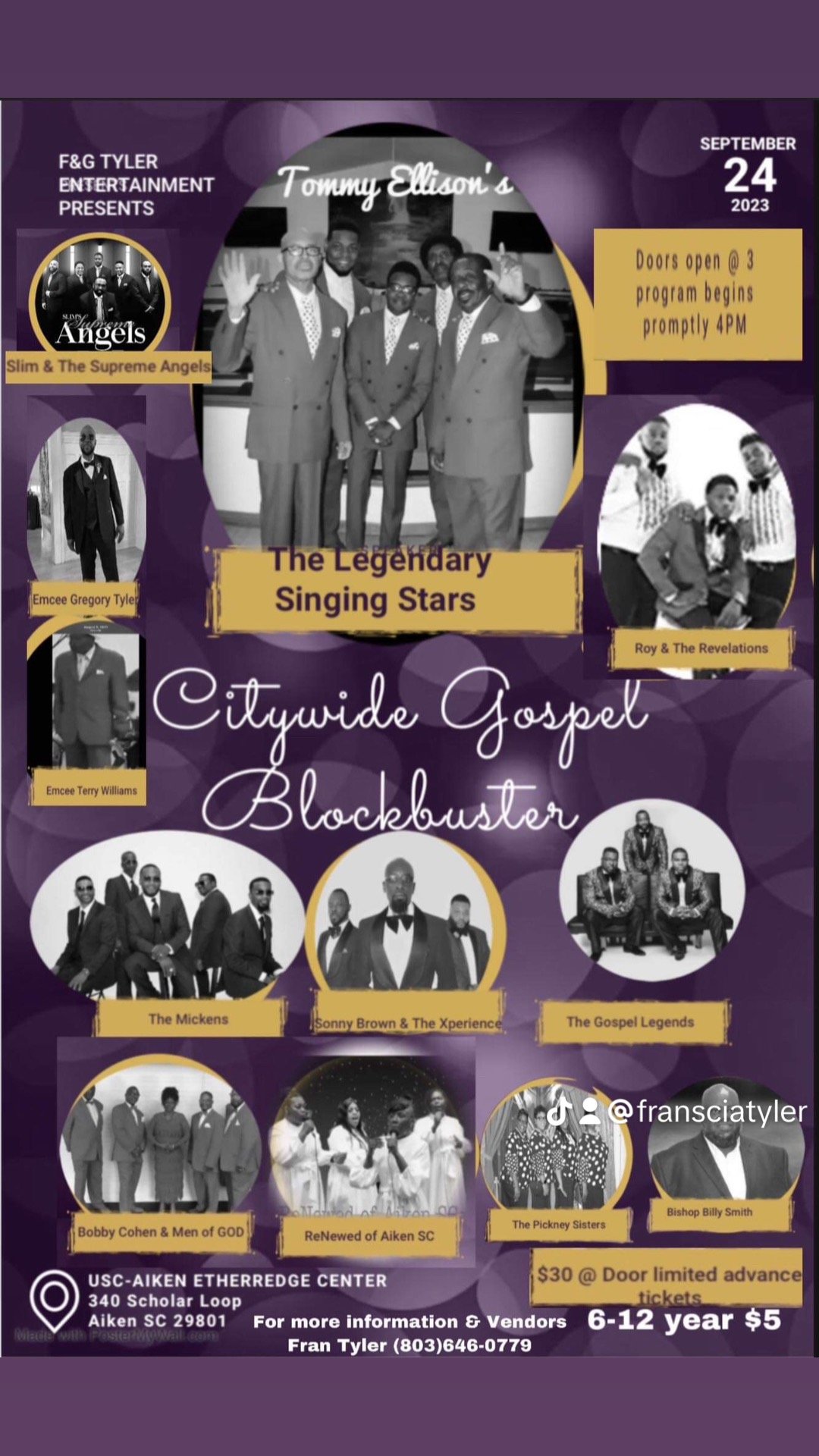Citywide Gospel Blockbuster Sunday, September 24, 2023 4:00 PM 8:00 PM 16:00 20:00 340 Scholar Loop Aiken, SC, 29801 United States (map) Google Calendar ICS SPONSORING ORGANIZATIONF&G Tyler Entertainment LOCATION340 Scholar Loop Aiken, SC 29801REGISTRATION LINK/NUMBER(803) 646-0779