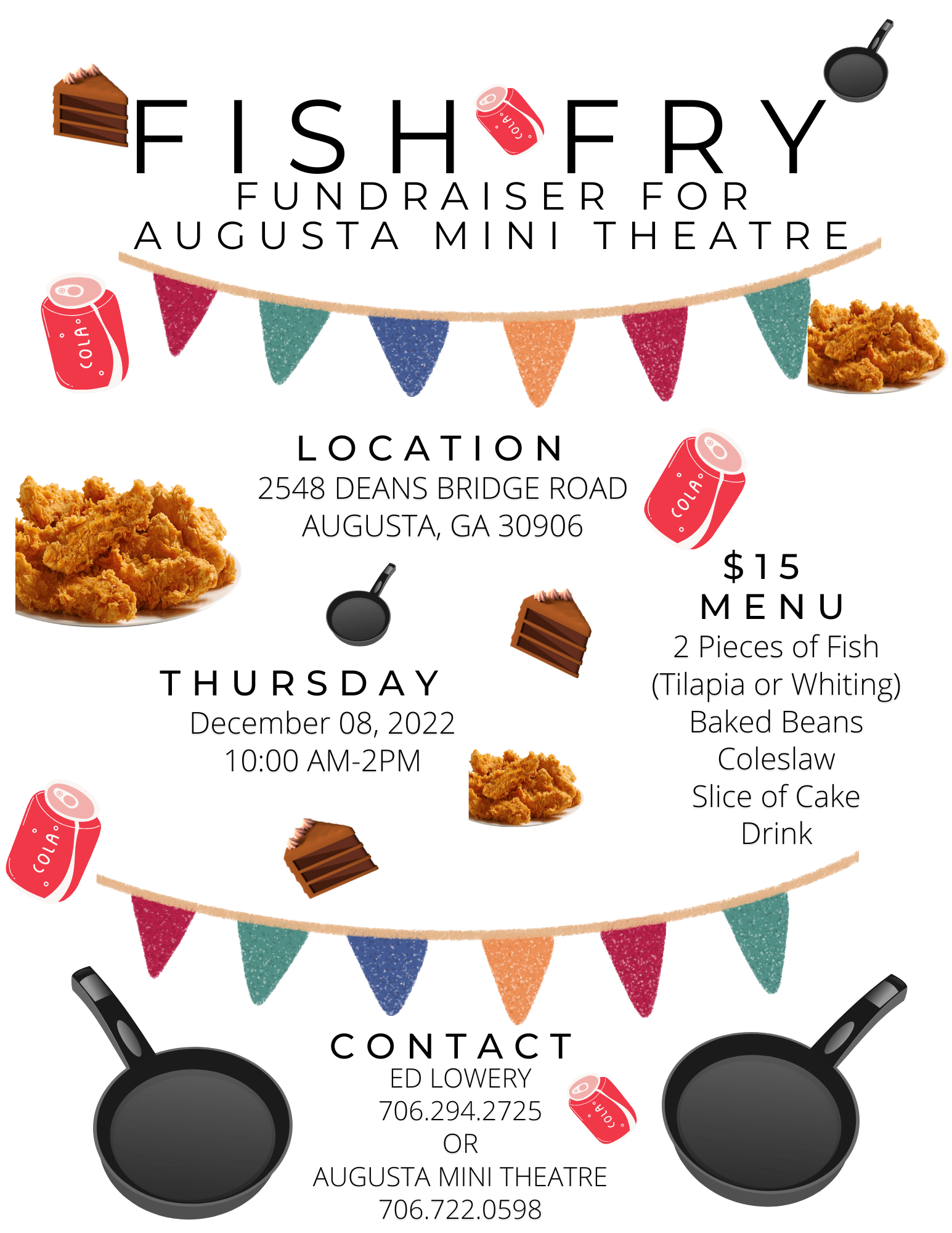Fish Fry Fundraiser for Augusta Mini Theatre Thursday, December 8, 2022 10:00 AM 2:00 PM 10:00 14:00 2548 Deans Bridge Road Augusta, GA, 30906 United States (map) Google Calendar ICS SPONSORING ORGANIZATIONAugusta Mini Theatre, Inc. LOCATION2548 Deans Bridge Road, Augusta, GA 30906 REGISTRATION LINK/NUMBERwww.augustaminitheatre.org View fullsize
