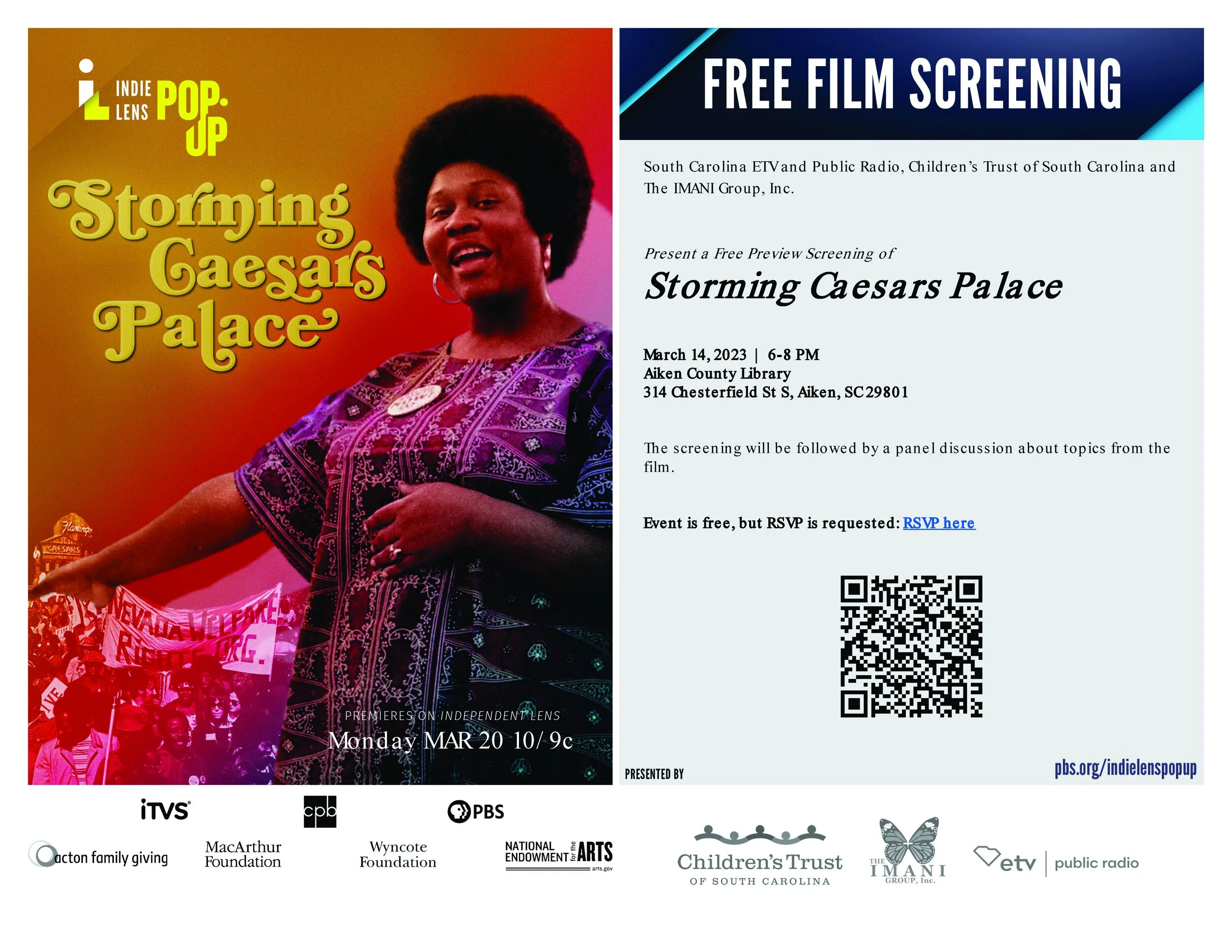 Indie Lens Screening- Storming Caesar's Palace Tuesday, March 14, 2023 6:00 PM 8:00 PM 18:00 20:00 314 Chesterfield Street South Aiken, SC, 29801 United States (map) Google Calendar ICS SPONSORING ORGANIZATIONSouth Carolina ETVLOCATION Aiken County Library 314 Chesterfield Street South Aiken, SC 29801REGISTRATION LINK/NUMBERhttps://www.eventbrite.com/e/indie-lens-pop-up-screening-storming-caesars-palace-tickets-567119498687 View fullsize