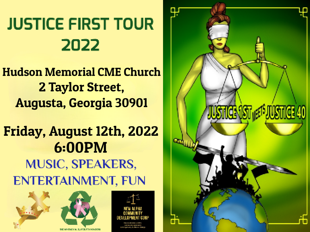 Justice First Tour - Augusta Friday, August 12, 2022 6:00 PM 18:00 Saturday, August 13, 2022 12:00 AM 00:00 2 Taylor Street Augusta, GA, 30901 United States (map) Google Calendar ICS SPONSORING ORGANIZATIONSustainable CSRA \ The Imani GroupLOCATION Hudson Memorial | 2 Taylor Street, Augusta, GA, 30901REGISTRATION LINK/NUMBERn/a View fullsize