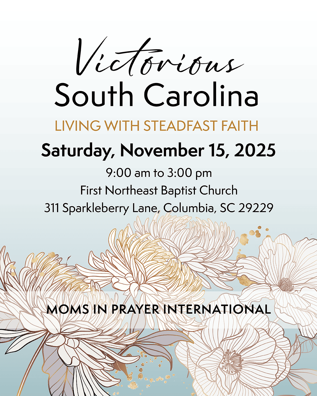 Victorious South Carolina Saturday, November 15, 2025 9:00 AM 3:00 PM 09:00 15:00 311 Sparkleberry Lane Columbia, SC, 29229 United States (map) Google Calendar ICS SPONSORING ORGANIZATIONMoms in Prayer InternationalLOCATION 311 Sparkleberry Lane, Columbia SC 29229REGISTRATION LINK/NUMBERhttps://share.google/GyAFDoRAkDE8jc8hS